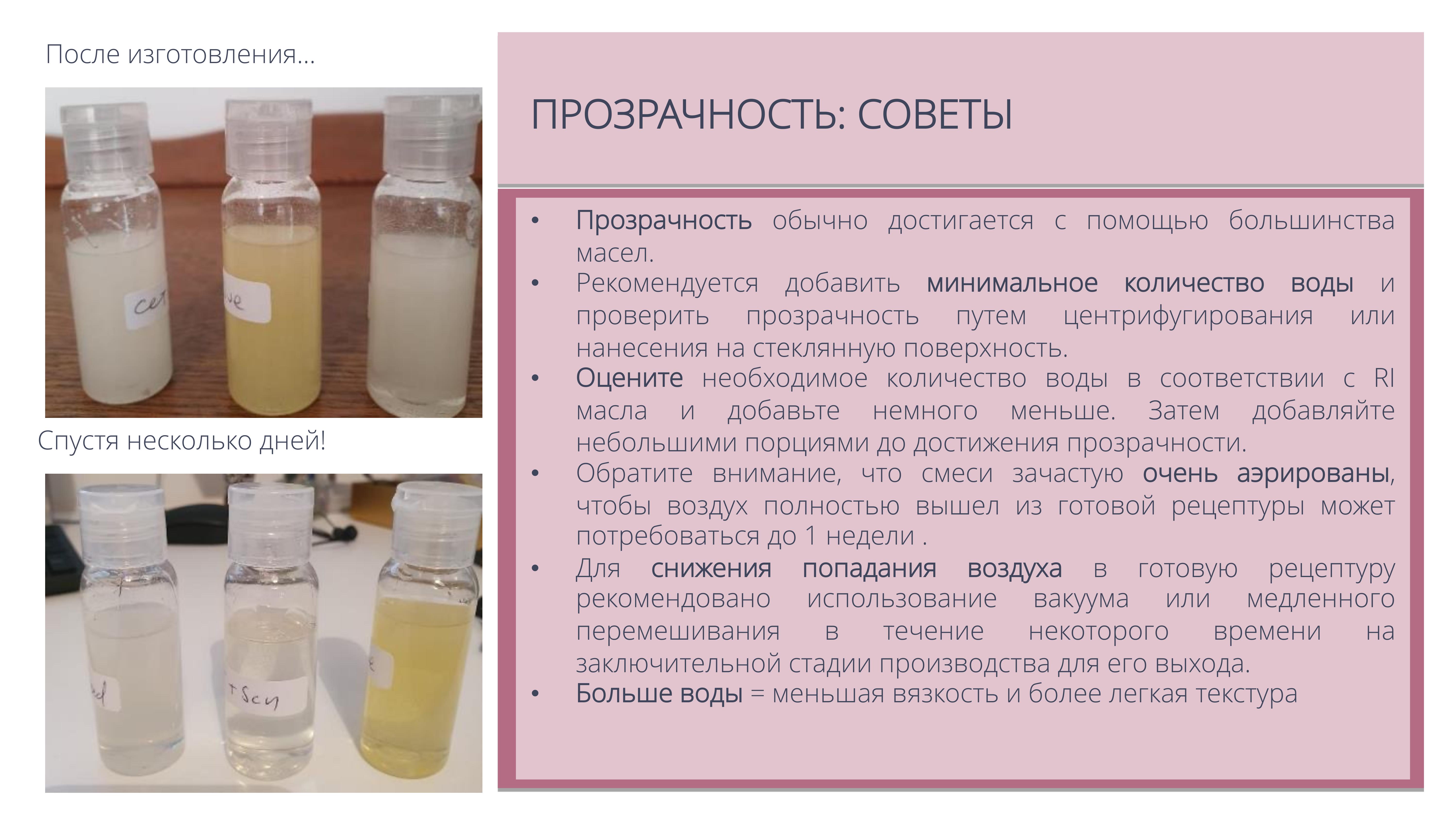 Позволяет создавать ультра актуальные прозрачные мицеллярные масла для очищения кожи и снятия макияжа, продукты для купания («молочные ванны»), гидрофильные масла для душа.