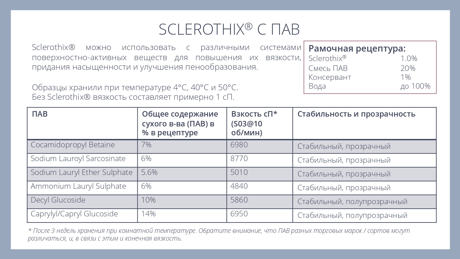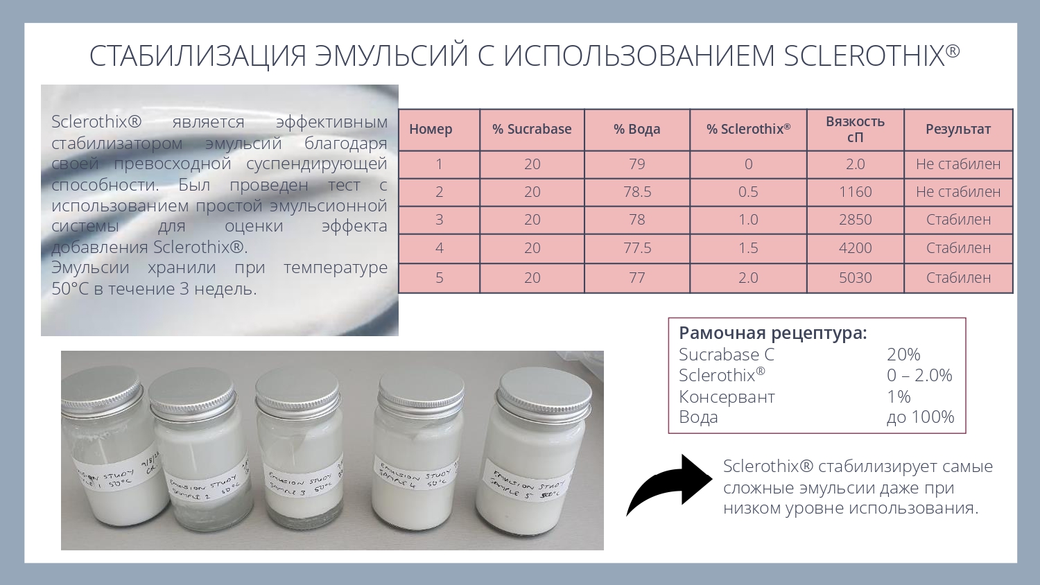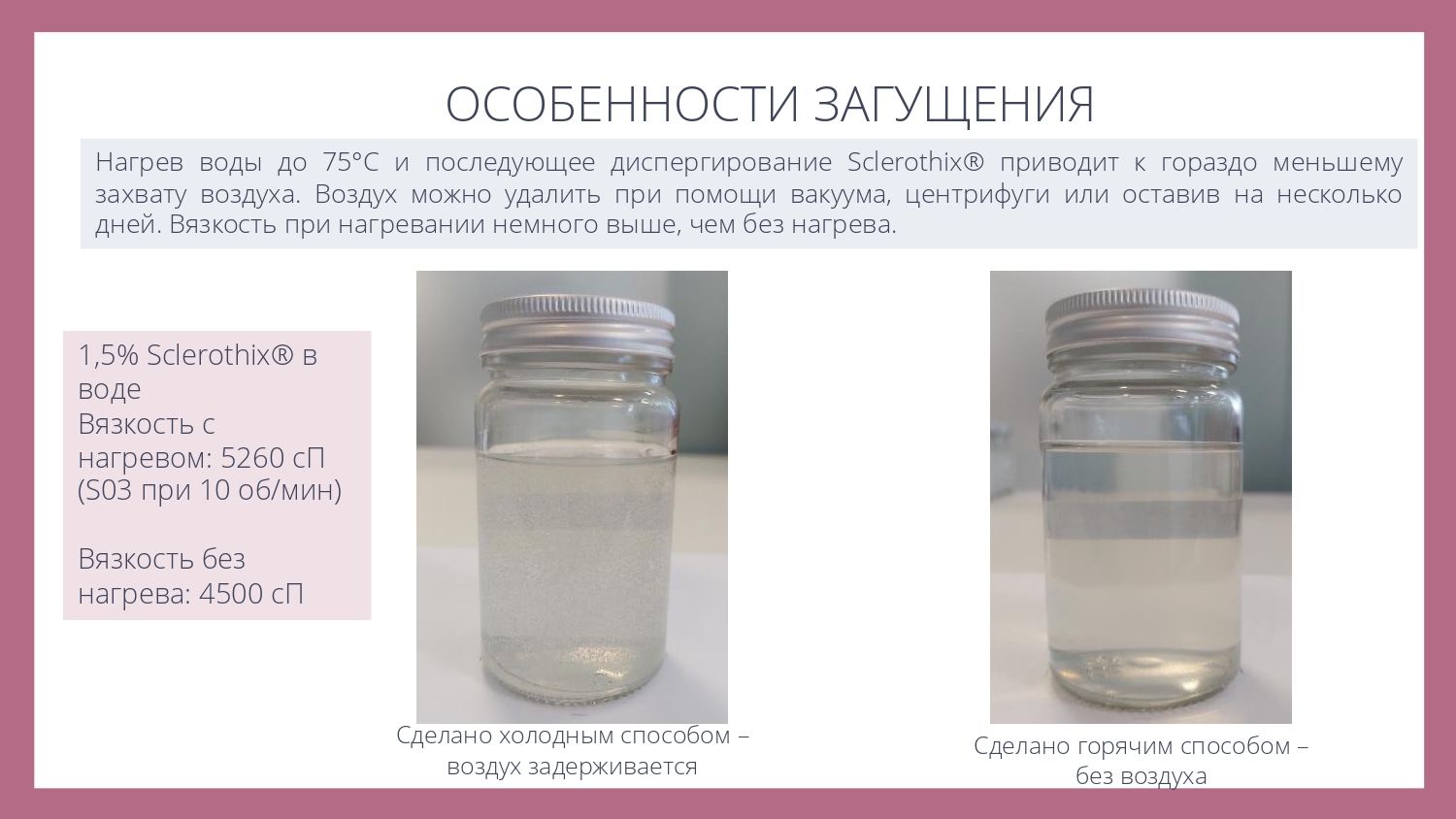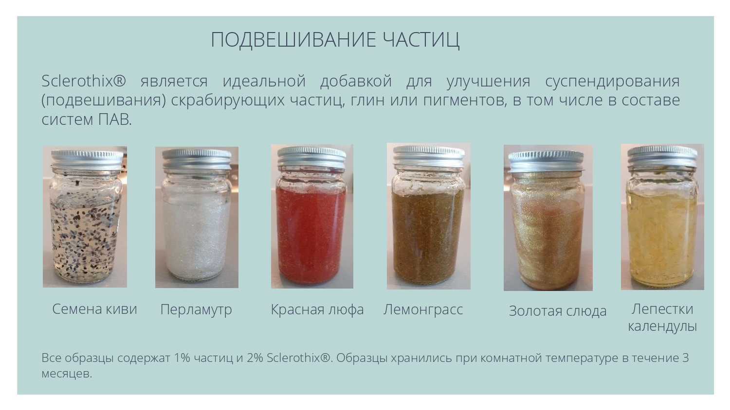 Sclerothix является эффективной добавкой для улучшения суспендирования (подвешивания) различных частиц - скрабов, глин или пигментов, в том числе в составе моющих систем.